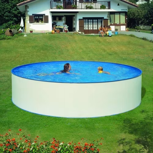 Poolen Acapulco består av en solid stålvägg som sedan bekläs invädigt med en vattntät poolliner/poolduk. Reningsverk, överdrag och stege ingår i paketet.