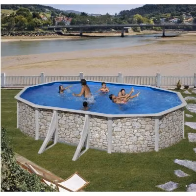 Med snygg stenimitation smälter poolen fantastiskt bra in i trädgården. Alla delarna är anpassade för en snabb och enkel montering.
