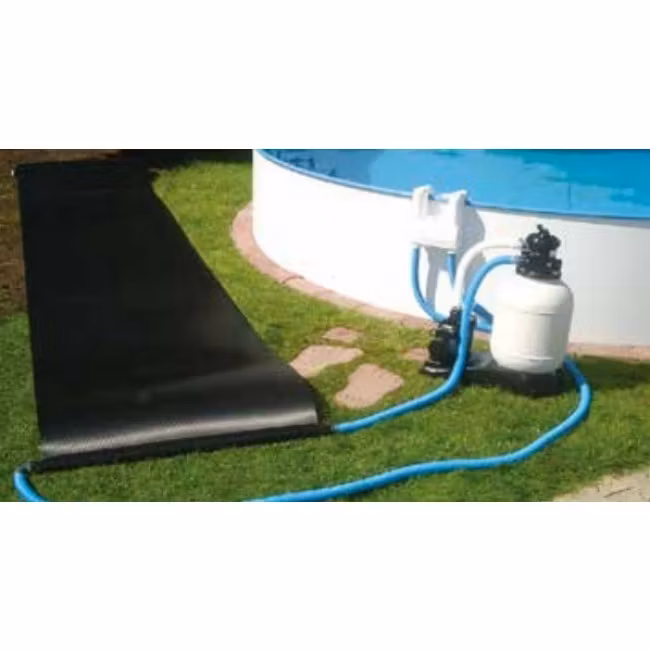 Solfångarens yta är 3,7 m² och den värmer vattnet upp till 6°C. För att få större solfångaryta kan flera set kopplas i serie. Solfångaren läggs på gräsmattan eller monteras på ett garagetak etc. För maximal effekt bör solfångaren monteras isydläge och vinkelrätt mot solen. Vi rekommenderar att du i tillägg täcker över din pool med en termofolie under den period du inte använder poolen.