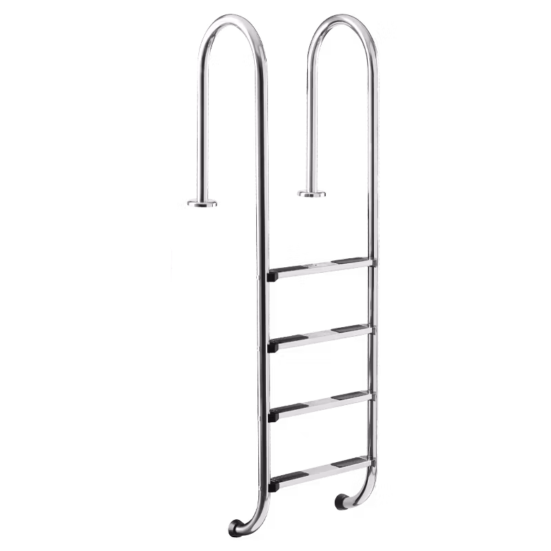 Stege av syrafast stål som passar nedgrävda pooler med 150 cm djup, 4 steg med halkskydd. Smal modell. Material: Rostfritt A2.