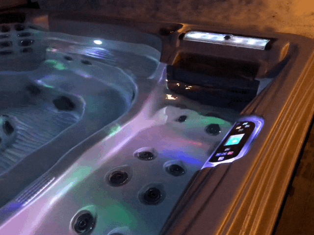 Flerfärgs LED-belysning som med fem undervattenslampor stämningsfullt och vackert lyser upp spabadet. Belyst Tranquility Fall och utsida på kabinettet.